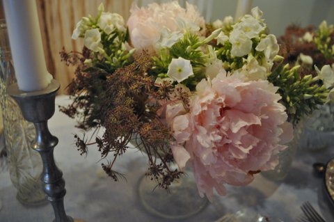 For the open house, Maggie and I decided to create a design that fit well in the warm open chapel. With white walls and dark concrete floors, the building lent itself to a simple elegant design. We rented our beautiful china and tableware from Four Inch Fold vintage rentals and set out to make a tablescape and background fit for an elegant affair. Maggie created the most delectable floral arrangements with soft pink peonies, delicate chocolate Queen Anne's Lace and sprigs of white phlox that brought an added layer of charm to the table. This was such a fun event, and we were so excited to be a part of it!